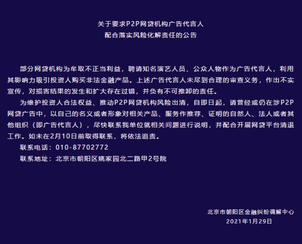 1月29日,北京市朝阳区金融纠纷调解中心(以下简称“调解中心”)发布公告,要求自即日起,请曾经或仍在涉P2P网贷广告中担任广告代言人的,尽快联系调解中心就相关问题进行说明,并配合开展网贷平台清退工作,如未在2月10日前取得联系,将依法追责。