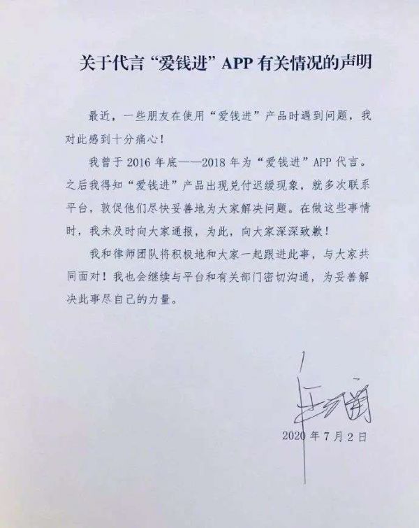 去年7月,爱钱进APP涉嫌非法吸纳公众存款而被立案侦查,受害人达到37万,被骗总额230亿。随后,爱钱进的前代言人汪涵发布声明称,他曾经知悉产品的兑付出现迟缓,也多次联系平台敦促解决问题,但并未及时向公众通报,并对此进行道歉。