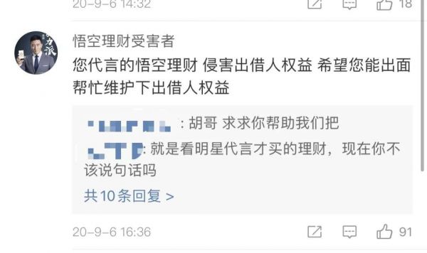 因此,P2P爆雷受害者对明星的态度往往是求助和诉苦,而非追偿。在胡军去年9月宣传综艺节目的微博下方,受害者们纷纷评论,“希望您能出面帮忙维护下出借人权益”、“胡哥,求求你帮帮我们吧”。