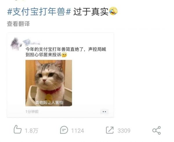 集齐五福后,支付宝新开辟了“打年兽”游戏,语音喊“牛”的“声控局”最为魔幻。有网友评论:“喊到担心邻居来投诉”“沙发上的妈妈觉得我疯了”。