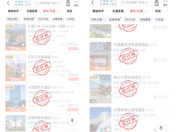 以云南大理为例,时代财经在大众点评上以“豪华/五星级”为筛选条件浏览发现,2021年2月13日至14日,大理THE ONE古城一号院、五彩云玉泉酒店、大理国际大酒店等多家酒店显示“已订完”状态,且这三家酒店均价在786元至1115元之间。