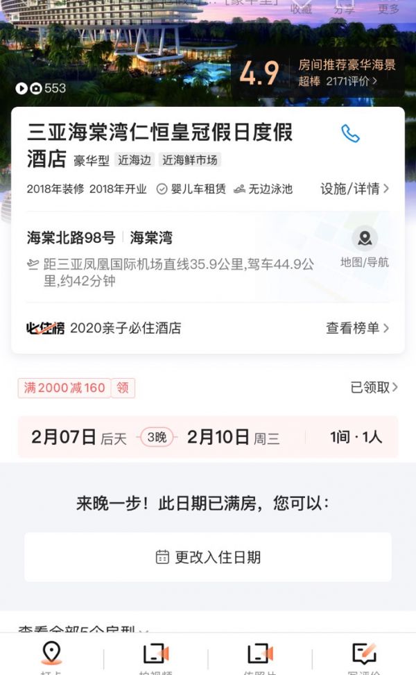 酒店度假的火热并不限于春节七天假期。张冰表示,由于越临近春节酒店价格越贵,也有不少顾客选择避开春节出行高峰到酒店度假,“像三亚海棠湾仁恒皇冠假日度假酒店,2月7号到10号所有房间早就订满了。”