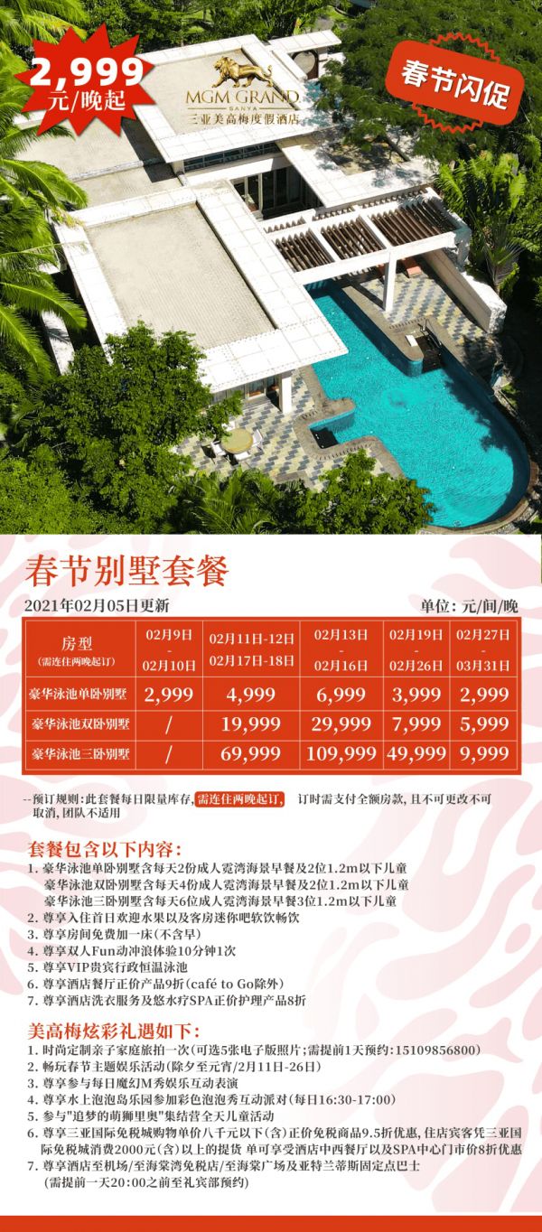 张冰介绍,当前可供预订的酒店套餐价格,一晚最低也要799元,最高则达到10万元。她介绍,以三亚美高梅度假酒店上架的春节别墅套餐为例,豪华泳池三卧别墅在2021年2月13日至2月16日期间,一晚价格为109999元,且该套餐“需连订两晚,预定后不可更改不可取消”。