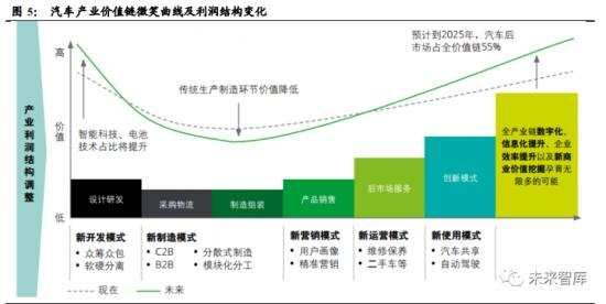 现在制造端在产业链里的价值比例会逐渐降低,降到10%不到。后市场价值却在逐步升高,预计到2025年以后,汽车后市场价值比例将占55%以上,数字化会成为重要的内容。比如制造这一步下放给吉利,百度自己做软件相关的事情,实现软件定义汽车,但这个生态如何保持活力,也是问题。而实际上,因为涉及到各种MCU的控制以及各种工业标准的相互连通,底层的软件估计还是吉利以及Tier 1提供,百度做上层整合。