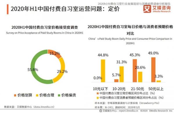 根据艾媒咨询调查数据显示,目前中国付费自习室日均价格集中分布在20元以上, 55.6%的中国消费者认为中国付费自习室价格偏贵。