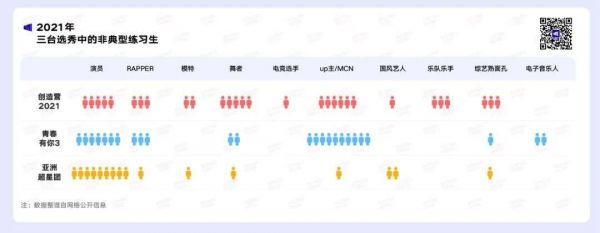 今年的练习生品类更加丰富和开放,除了稳定派出超过20名练习生的演员队伍,由于近一年选秀节目中对VOCAL、DANCE和RAP单项实力日渐看重,RAPPER和舞者出身的练习生,反而在成团比重中占据了一定的话语权。除此之外,今年引发最多热议的要属《王者荣耀》KPL所属eStarPro电竞俱乐部职业选手诺言参加《创4》的消息。这类非典型练习生们在节目中的表现值得市场关注。
