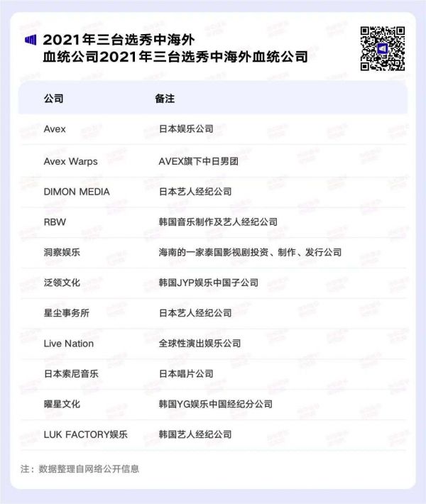 除了泛领文化、曜星文化这类曾经参加过国内选秀的韩国经纪公司的中国分公司,Avex、星尘事务所、LUK FACTORY娱乐等海外公司纷纷直派本国练习生参加中国的选秀节目。同时,作为全球知名的演出娱乐公司,Live Nation也首次派出旗下电子音乐人参加偶像选秀。从这些纷纷下场的海外公司不难看出,尽管偶像选秀的热度逐年下降,但选秀类综艺仍是更多领域市场曝光的重要一环。