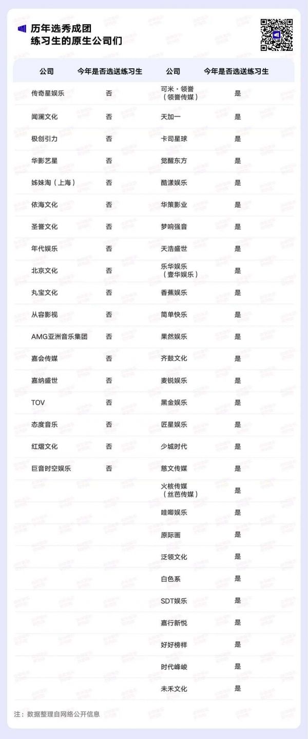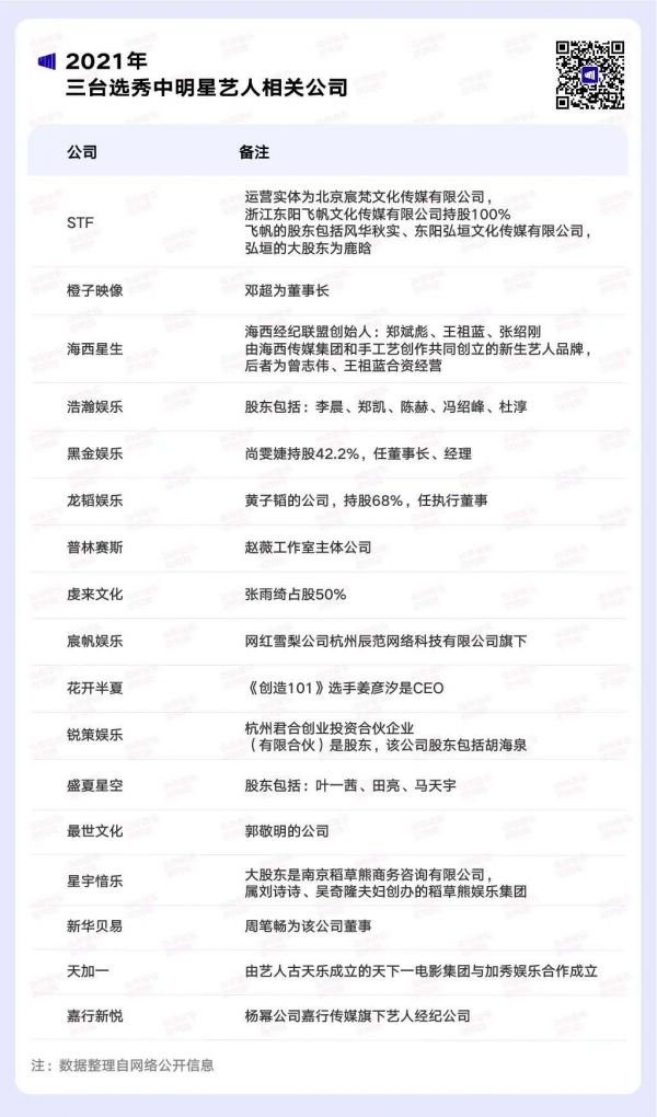 今年的三台选秀中,龙韬娱乐依然入局。褪去了发起人的限制,公司今年分别在《创4》和《青3》选送练习生参赛。此外,在这两档节目中选送了6名练习生的经纪公司STF也同样受到关注。天眼查显示,运营实体为宸梵文化的STF为浙江东阳飞帆文化传媒旗下公司,而飞帆文化的股东正包括作为初代顶流的鹿晗。