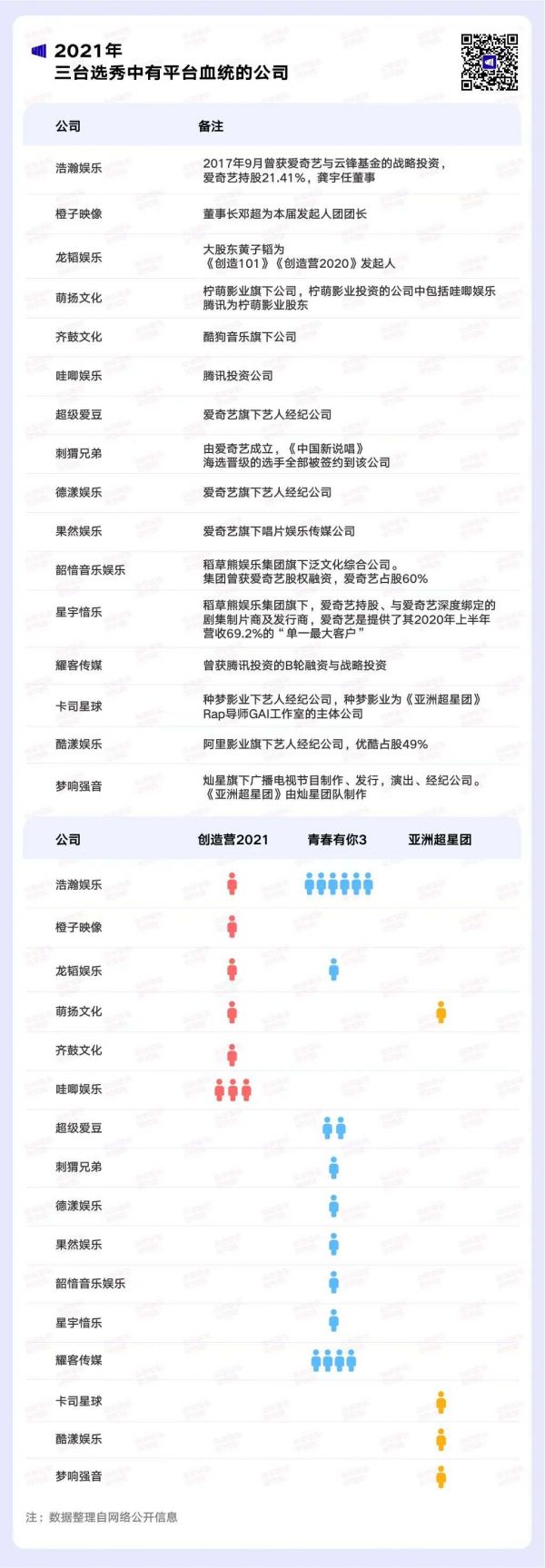 与此同时,不少入场的公司也同平台方有着千丝万缕的联系。《创4》中,柠萌影业旗下的萌扬文化选送了一名练习生参赛,而创系列的成团艺人运营方哇唧娱乐正是柠萌影业投资的公司之一。《青3》中,爱奇艺本家成立的艺人经纪公司就有三家。《超星团》中,同时有阿里影业旗下的酷漾娱乐艺人参赛。