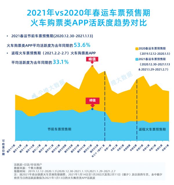 2021年春节,受国家号召,不少人选择在工作的城市“就地过年”,这也改变了众多人回家过年的行程。每日互动(股票代码300766)个推大数据关注了春运期间,火车购票类APP活跃情况,一线、新一线城市返乡人群情况,通过数据解读这个“特殊年”各大城市人口流动情况。