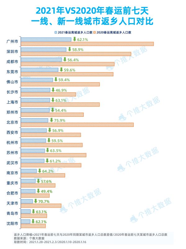 个推大数据显示,2021年春运前七天,19个一线、新一线城市返乡人口数量都较去年同期有较大幅度的减少,最高降幅超七成,最低降幅也近五成。
