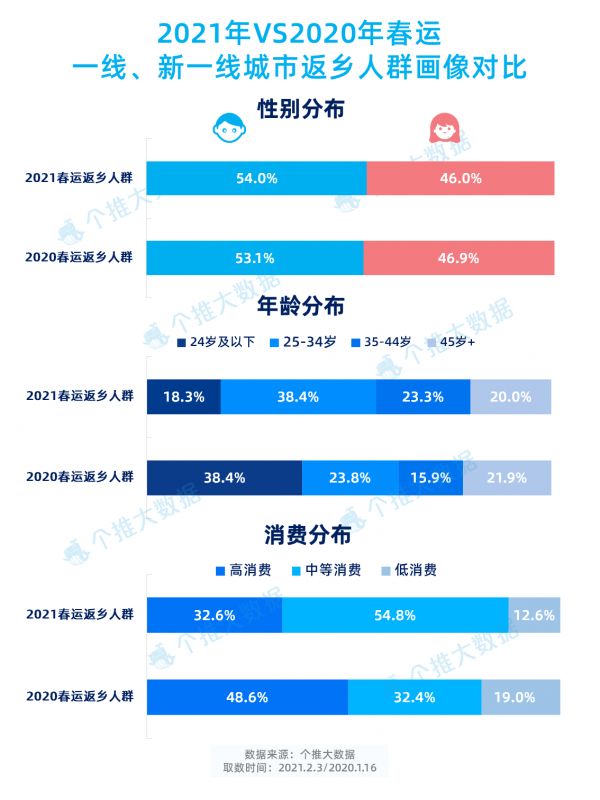 返乡人群有哪些特征呢?个推大数据持续关注了19个一线、新一线城市这两年的春运返乡人群用户画像情况。