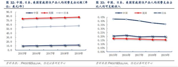 不过,对标美国、日本等成熟市场,我国家庭清洁支出仍处于低位。2019年我国人均家庭清洁产品消费支出为12美元/年,占人均可支配收入的比例为0.2%,同期,日本及美国人均清洁产品消费支出分别为57美元/年、78美元/年,对应人均可支配收入占比0.36%、0.16%。