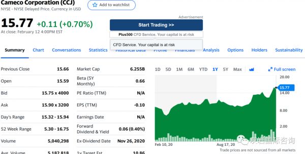 Cameco(CCJ) Cameco是全球主要的铀生产商,公司旗下的雪茄湖矿区是全球品位最高的铀矿之一。截止今年三季度末,雪茄湖已经生产了230万磅铀浓缩物。然而由于暂时停产,该公司预计在2020年无法实现530万磅的产量。而当上周这家公司发布公告,市场马上做出了反应。CCJ公司在铀工业上的生产成本同时也是最低的。