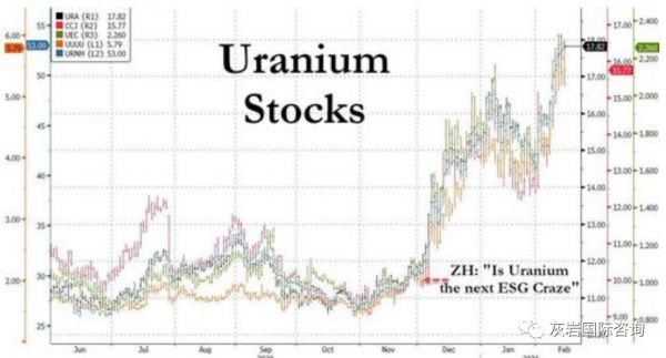 本身以铀为题材的股票就非常稀少,同时也缺乏华尔街的关注,尽管从近期铀价格的飙升来看,市场开始意识到投资的风向。毋庸置疑,拜登政府对核能的承诺将导致这个股票板块的价格进一步大幅超越市场基准水平。