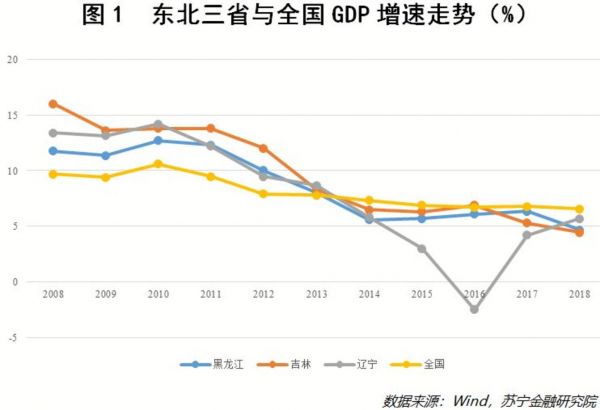 近些年,东北经济颇为低迷,尤其是自2014年起,东北三省的GDP增速一直都低于全国平均水平,个别年份甚至出现负增长态势(参见图1)。