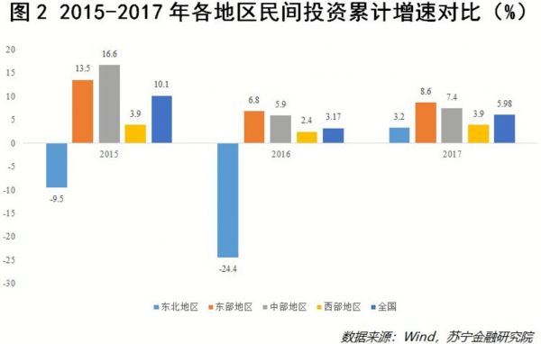 国家统计局发布的数据显示,2015~2017年,东北的民间投资累计增速始终为全国四大区域板块中表现最差的,2015年与2016年更是全国唯一的民间投资负增长地区,增速分别为-9.5%和-24.4%(参见图2)。