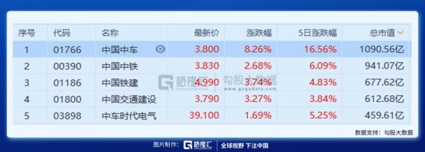 高铁基建:港股高铁基建股集体上扬,中国中车两天大涨13%,中国中铁、中国交通建设中国铁建均拉升走强。有机构称,近期的两会即将开始,新基建被给予厚望,政策支持叠加人口城镇化推进,十四五高铁轨交等交通基建将保持较高景气度。政策要求梳理明确市域铁路三年开工项目计划,建设总规模约6000公里,近期河南/江苏/山东等多地密集披露交通基建规划。