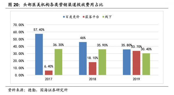 国海证券近期在研报中提到,高毛利是医美机构的普遍特征。2019 年大陆地区六家典型医美上市机构平均毛利率高达 51.19%。国内医美机构仍处于品牌建立和培育的市场分散竞争激烈期,各类医美机构还处于只能通过大力营销争相提高知名度的阶段。