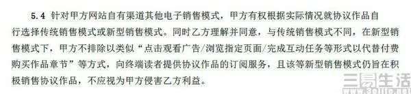 随着吴文辉等“五巨头”的离开,网络中也传出一纸阅文集团为网文作者所提供的新版合同。在这份已经被部分作者证实的合同中显示,“甲方不排除以类似点击观看广告/浏览指定页面/完成互动任务等形式,以代替付费购买作品章节等方式,向终端读者提供协议作品的订阅服务”。