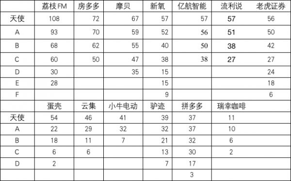 上面的单位都是月,比如说荔枝FM,天使108,也就是说从天使投资到上市,花了108个月;