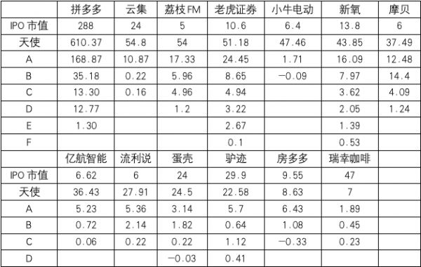 除去瑞幸咖啡、荔枝之外,大多数公司是在天使投资后4-6年之间上市,也就是说48-72个月之间。当然驴迹和拼多多也是个飞毛腿,很快就跑到IPO。
