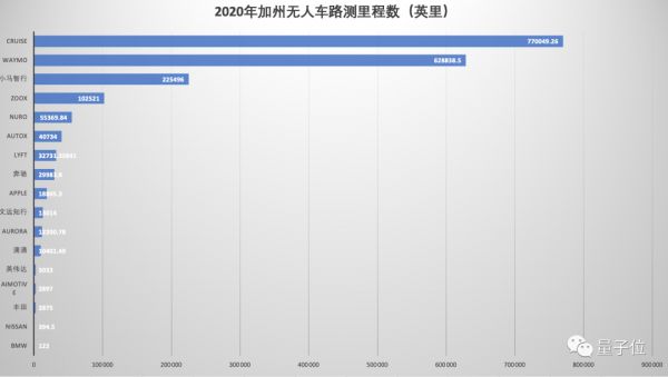 2020年加州路测里程,分化非常明显,头两名Cruise和Waymo,凭借体量的优势,两骑绝尘。
