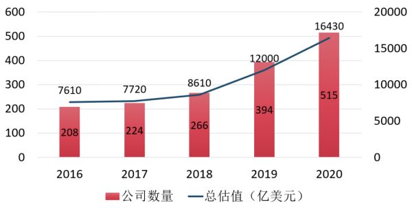 图 1 全球独角兽数量和估值稳步上升 来源:TechCrunch,CB Insights