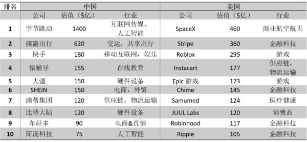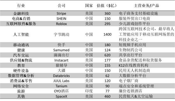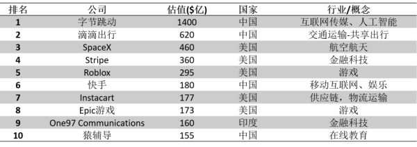注:由于榜单收录时快手尚未上市,因此仍计算在内 表 1 全球估值前十的独角兽榜单来源:CB Insights