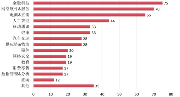 独角兽企业的行业分布上,独角兽分布在15个细分行业中。金融科技为最热门的领域,涌现了75家独角兽,互联网软件服务有70家公司上榜,电商直销有65家公司上榜(图 3)。