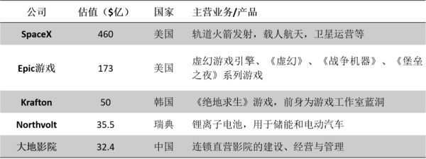 归类至“其他”行业的35家独角兽中,估值超过50亿美元的仅有SpaceX、Epic Games和Krafton。Epic Games最为知名的产品是其开发的“虚幻引擎”,该引擎被广泛运用于开发各种类型的3D游戏。Krafton旗下最为知名的产品则是风靡全球的“吃鸡”游戏《绝地求生》。前三名之后的独角兽也不乏一些高知名度的明星公司,如欧洲的动力电池龙头企业Northvolt,《碟中谍》、《星际迷航》、《终结者》等多个大IP系列电影的制片商Skydance Media和近年来风靡全中国的连锁茶饮品牌喜茶和奈雪的茶(表 4)。
