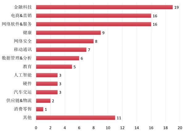 2020年的新晋独角兽中,68家来自美国,占到了62%,中国仅有9家在2020年入围独角兽榜单。新晋独角兽最多的行业依然是火热的金融科技、电商&直销、网络软件&服务这三个行业(图 5)。在新冠疫情让全球人民格外依赖互联网的特殊背景下,大健康领域和网络安全领域这两个本身独角兽企业数量相对并不多的行业,在2020年诞生了较多的新独角兽公司。