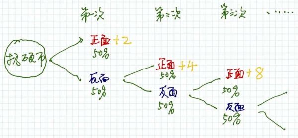 第一次掷出正面,就给你2元;