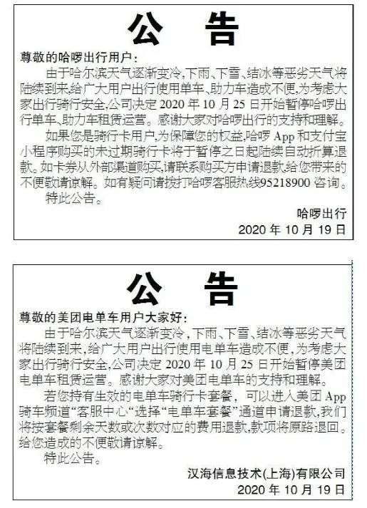 2020年10月,哈尔滨宣布,考虑到降雪季即将到来,天冷路滑,共享单车25日前全部入库“冬眠”,次年春季再恢复正常使用。随后,各大共享单车运营商不得不响应政策,发布了暂停运营的公告。看来冬季里的哈尔滨街道,注定与两大新兴出行工具无缘。