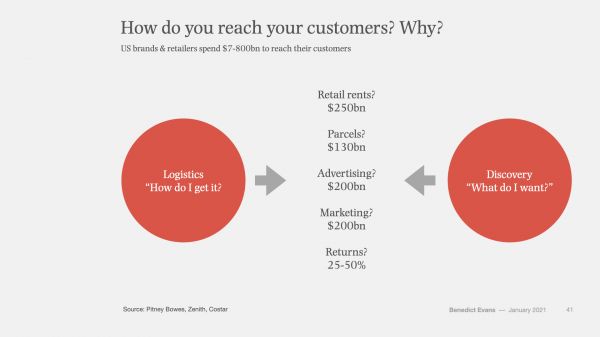 电子商务是从物流这头开始,是一种新的(有时候)更有效的获取某个东西的方式。这种手段未必就是更有效率的——你不会连午餐都要邮寄到自己办公桌上。相反,在零售业什么样的物流才合适是个代数问题。涉及到需要多少库存,多少SKU,产品的大小,产品的运输速度如何,购买频率如何,你愿意开车或走路的距离有多长,产品是否需要冷藏,或者保暖,每平方米的成本是多少等——这个方程有各种可能的输入,如果进行可视化的话,你会得到一个多维散点图,这张图会告诉你为什么宜家会在城市的边缘设立庞大的店铺,沃尔格林(Walgreens)为什么要在当地设立小药店,为什么在曼哈顿的每个街区都可以买到牛奶,但却未必能买到冰箱。