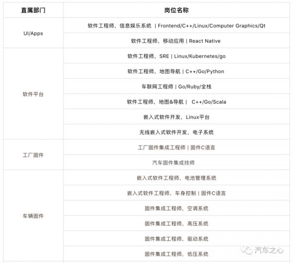 而且,在车辆软件层,特斯拉也在大力招揽软件工程师,囊括信息娱乐系统、地图导航、移动 App 等等领域。
