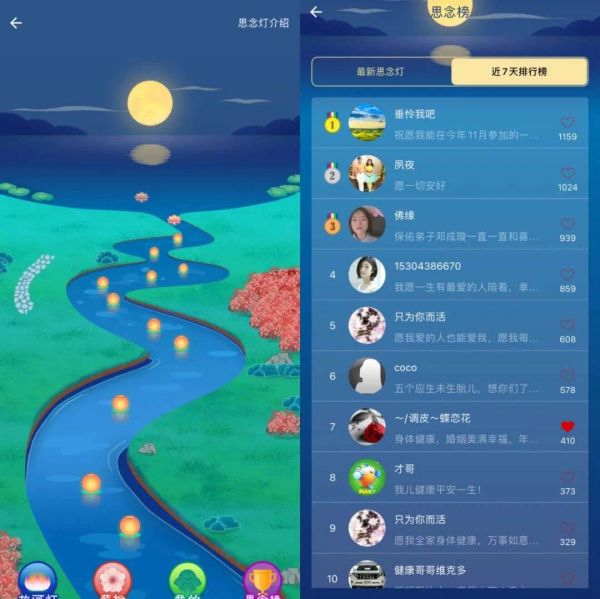 我心想真的有人花十几块在软件里放灯表达思念?事实证明我还是太年轻,有,而且还不少。