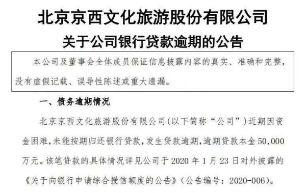 1月25日晚间北京文化晚间发布公告称,公司近期因资金困难,未能按期归还银行贷款,发生贷款逾期,逾期贷款本金5亿元。北京文化称,目前公司正在积极与债权银行沟通,公司将通过出售资产、电影项目融资等方式,全力筹措资金,缓解公司资金紧张局面。