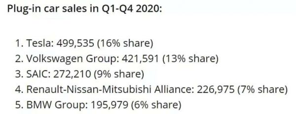 在2020年的新能源汽车销量榜单中,特斯拉以499535辆的销量夺得全球新能源汽车销冠。第二名则是大众,它的销量成绩为421591辆,并且大众的销量已经开始逐渐接近特斯拉,甚至有些要赶超特斯拉的势头。第三名到第五名分别是上汽集团、雷诺-日产-三菱联盟。