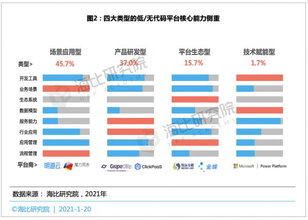 海比研究通过调查发现,明道云在场景应用型方面具有明显优势,葡萄城和ClickPaaS在产品研发型方面优势较大;致远互联、金蝶在平台生态型优势显著。