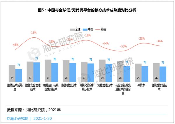 中国市场的低/无代码平台技术成熟度与全球市场差距不大,差值仅有4.8%。其中,在数据安全、可视化和AI技术等方面与全球技术水平基本持平;相对而言,先进技术的融合度方面差距最大,应做重点改进。