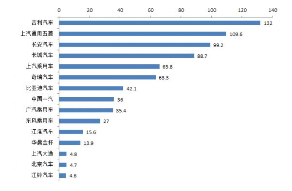 图1:2020年1-12月中国品牌乘用车销量排名TOP 15(单位:万辆),资料来源:中汽协