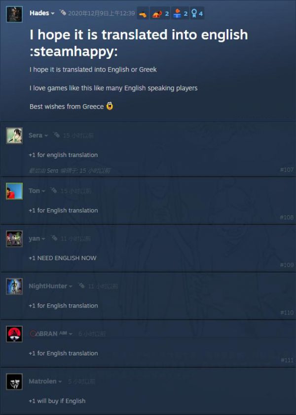 在《鬼谷八荒》的Steam社区内,也出现了“出英文吧,求求了”的外国玩家,像极了当年我们在评论区留言“we need chinese”的样子。