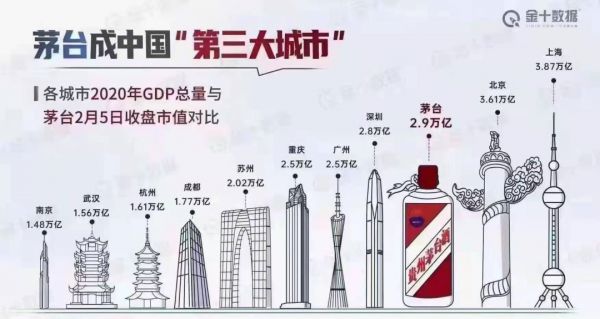 2月5日,《金十数据》一张“茅台成中国‘第三大城市’”的图片被网友疯传,而这张图片的依据则是截至2月5日A股收盘,贵州茅台报2313元/股,总市值2.91万亿元,不仅甩出A股老二工商银行1万多亿元,更是超过深圳GDP。
