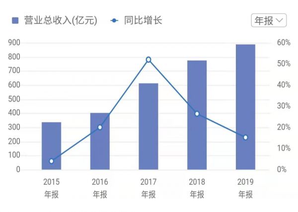 根据贵州茅台的财报显示,其在2017年、2018年、2019年的营业总收入分别为610.63亿元、771.99亿元、888.54亿元,同比增长分别为52.07%、26.43%、15.10%。