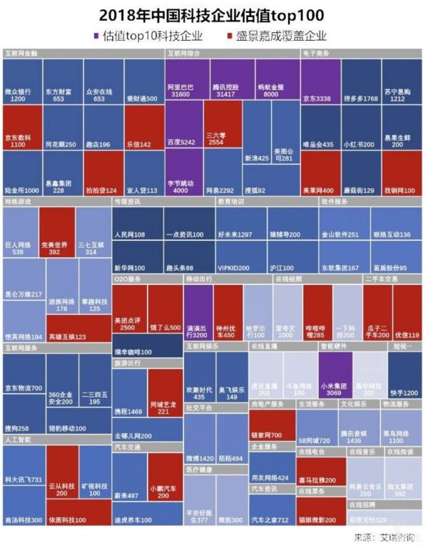 借用艾瑞咨询的调查报告,为大家展示一下中国2018年互联网企业价值榜top100,其中标记紫色的是top 10,标记红色的是我们覆盖的企业,有21家。(这个比例已经蛮高了。)