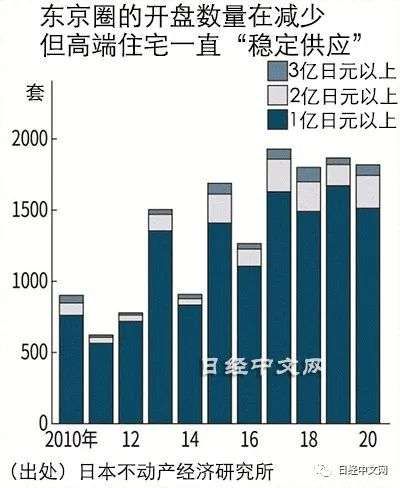 2020年东京圈上市的新建楼盘低于3万套,这是经济泡沫破灭后1992年以来的最低数量。另一方面,每套平均售价突破6000万日元(约合人民币367.28万元),创出1990年以来的新高。售价在1亿日元(约合人民币612.13万元)以上、且每坪(3.3平方米)单价超过1000万日元(约合人民币61.21万元)的超高价房产在最近几年稳定供应约2000套,正在推高行情。