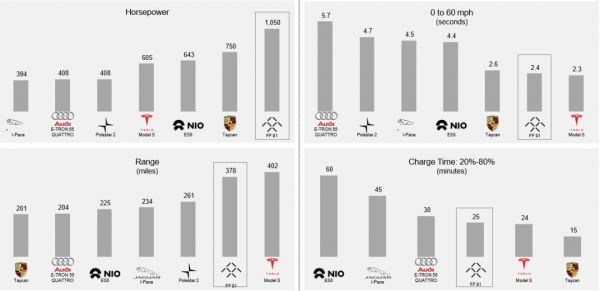 早在2017年1月,FF就在拉斯维加斯正式发布量产车型FF91,续航里程达到378英里(608公里),比Model S高出63英里,并支持高于200千瓦的充电功率。动力方面,FF91三电机版本总功率可以达到1050马力,0到60英里加速为2.39秒,而特斯拉Model S的这一速度是2.5秒。