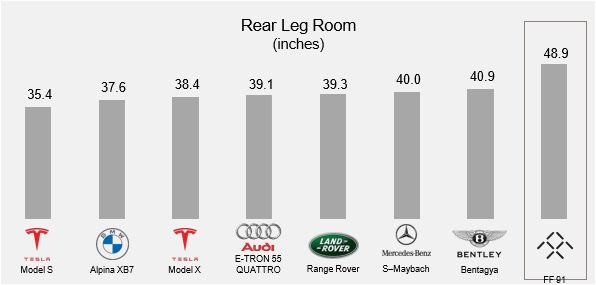 例如,定位于中大型SUV车型的FF91,车身长度达到5250mm,轴距长达3200mm,已经达到了传统意义上D级车的水平,其后排腿部空间长度达到48.9英寸(1.24米)。