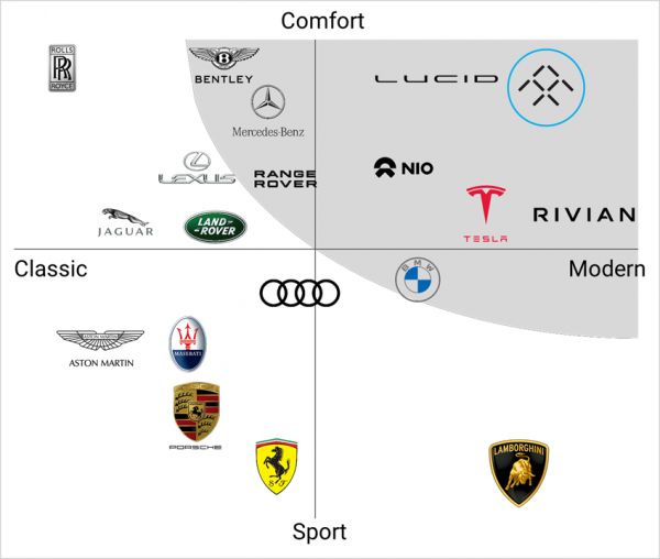 在商业计划书中,FF也直接将迈巴赫S级、保时捷Taycan、奥迪E8 e-tron、宝马7系作为FF91的对标竞品。按照公司的说法,FF91在舒适感和智能性两个维度几乎达到了全球最佳(下图)。